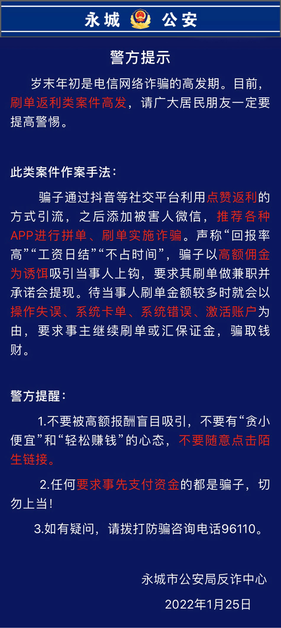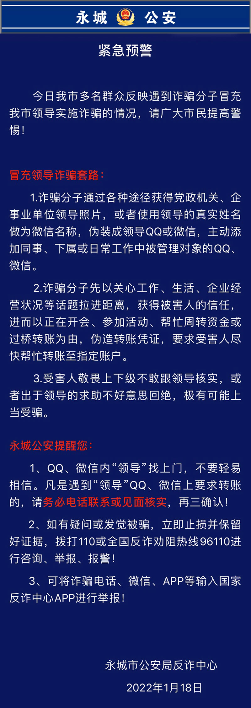 當(dāng)前位置:首頁 -> 公文通告 -> 永城公安關(guān)于反詐緊急預(yù)警