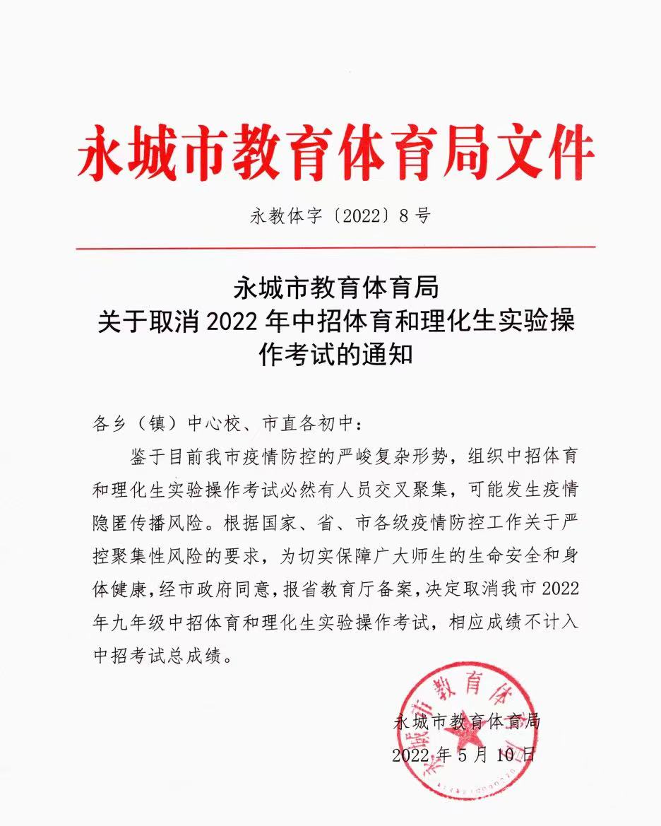 永城關(guān)于取消2022年中招體育和理化生實(shí)驗(yàn)操作考試的通知